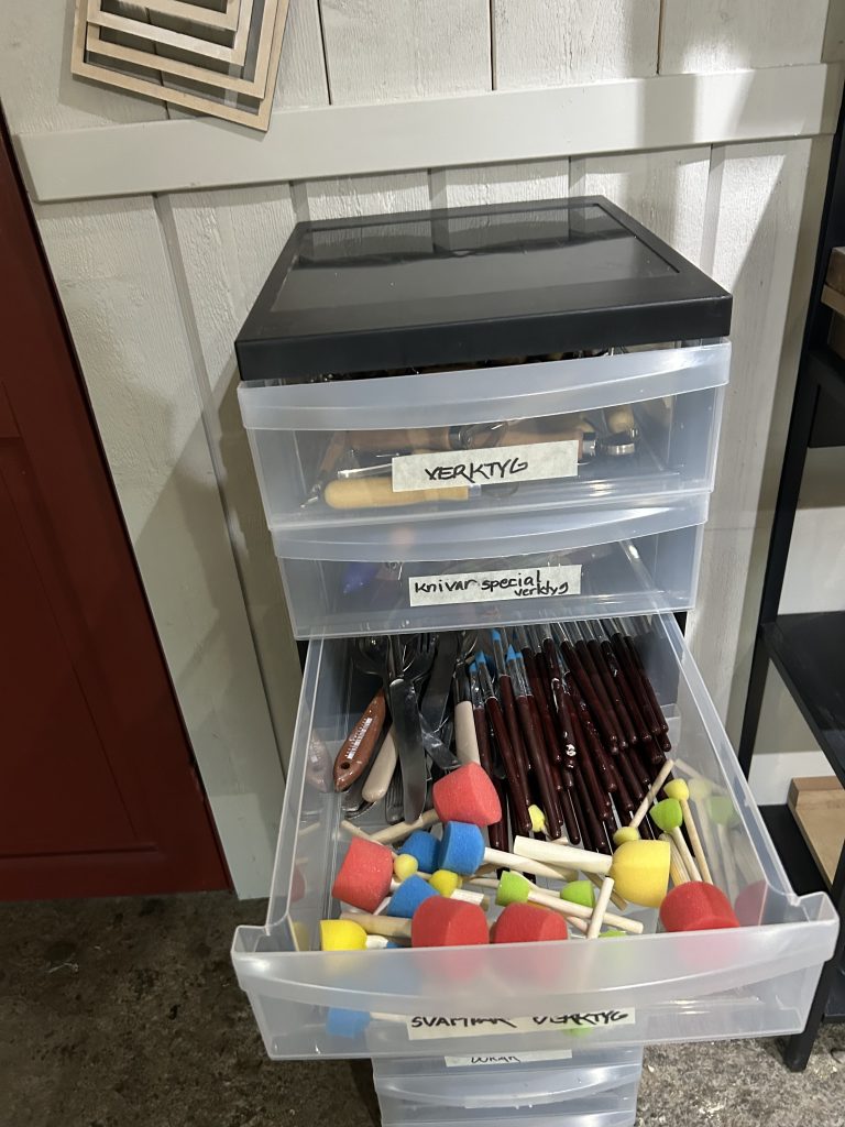 Du kan även måla med akryl, olja, akvarell och Gelli Plate.. I ateljén har du tillgång till allt och det enda du behöver ta med dig är dina färger och duk/akvarellpapper. Vill du arbeta med lera köper du lera för 95 kr/kg. Jag arbetar med stengodslera och nästan uteslutande med penselglasyr vilket ger en enorm frihet i skapandet.
